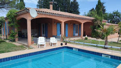 Vente villa Le Muy. Dans un secteur résidentiel, charmante villa entièrement de plain-pied d'env 120 m² édifiée sur une parcelle de 1400 m². Elle offre : Entrée, vaste séjour ouvrant sur terrasse, cuisine us équipée, 4 chambres, salle de bain et salle d'eau. Belle terrasse couverte avec cuisine d'été. Une piscine ainsi qu'un boulodrome agrémente le jardin joliment arboré. Garage avec buanderie.
